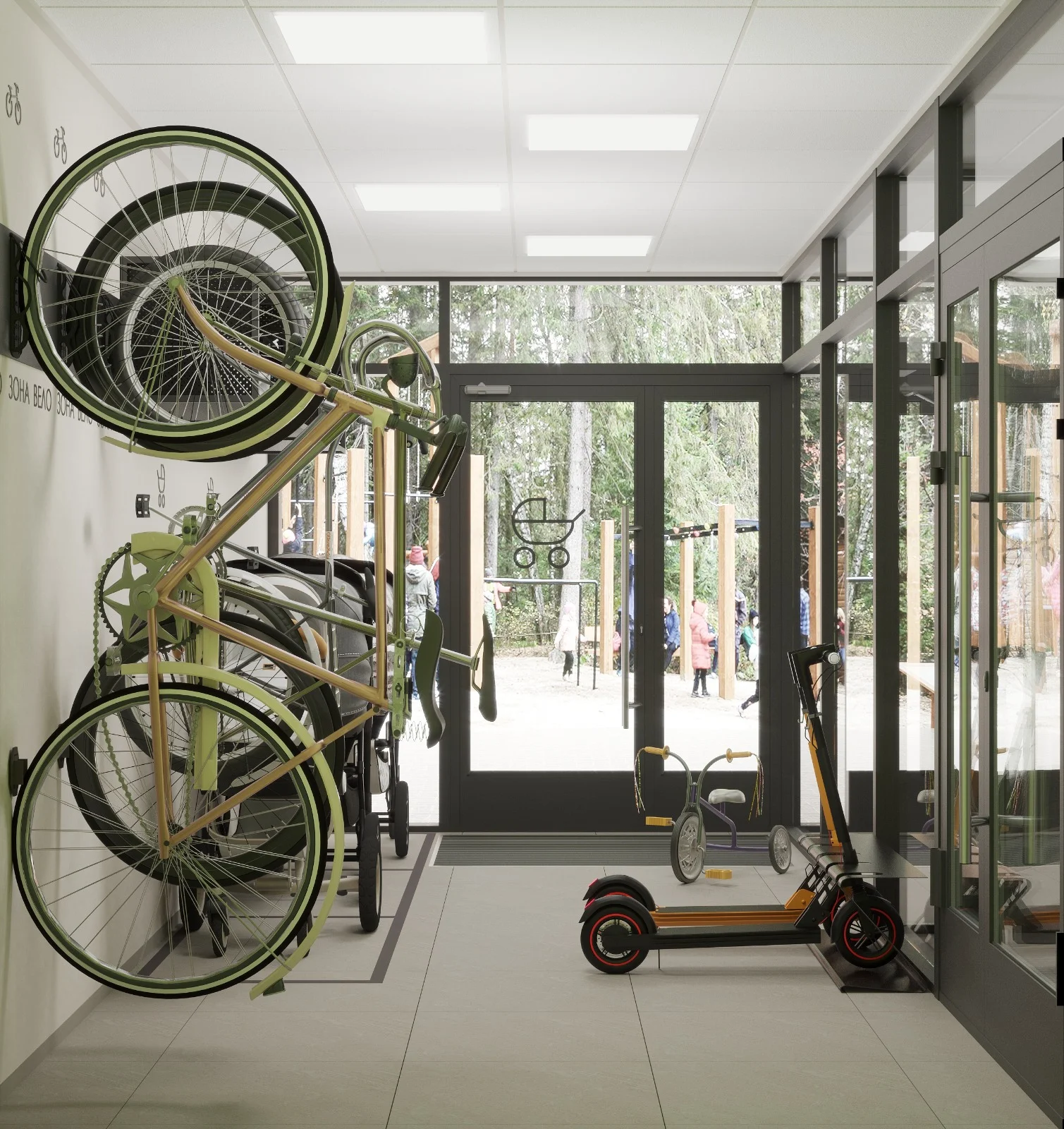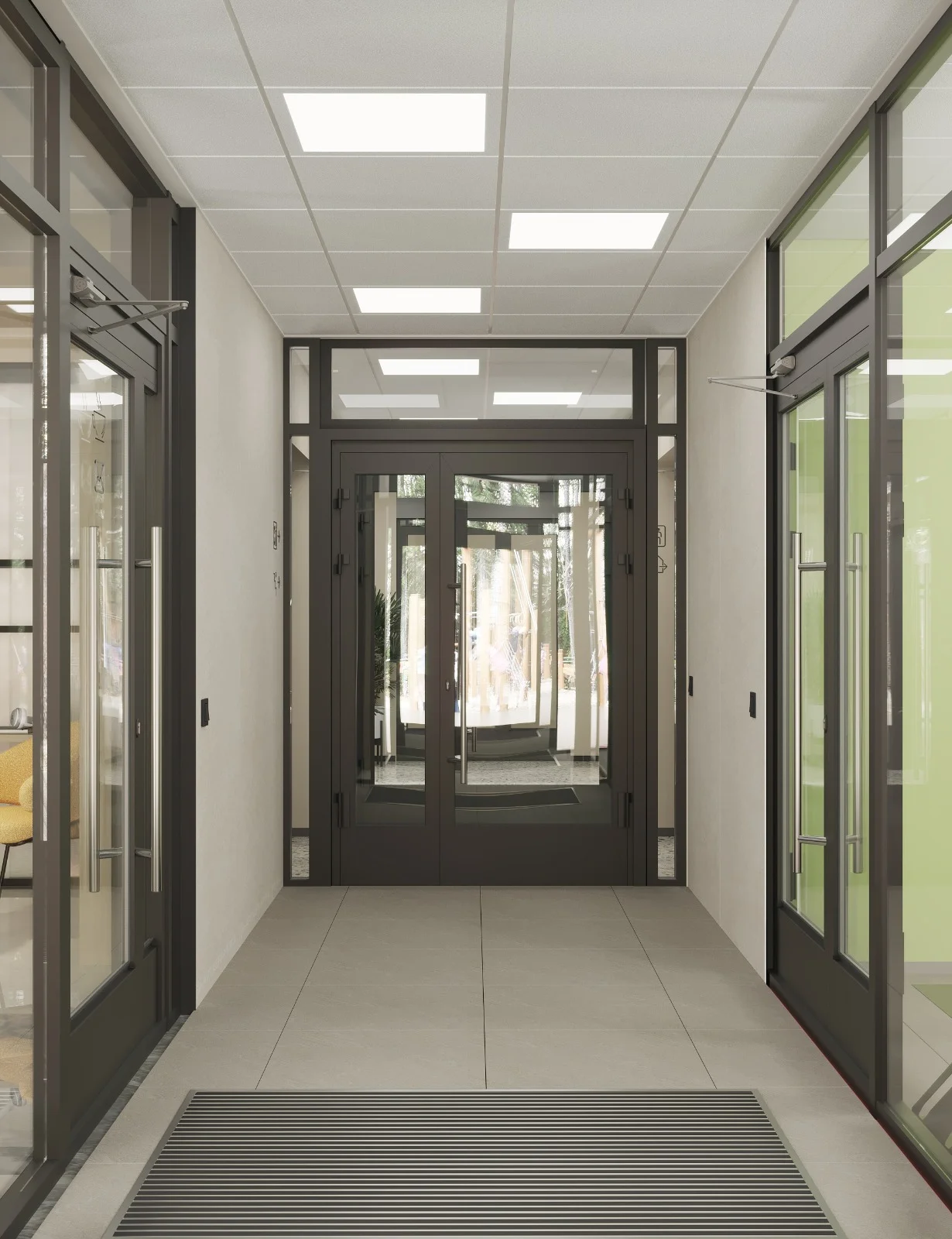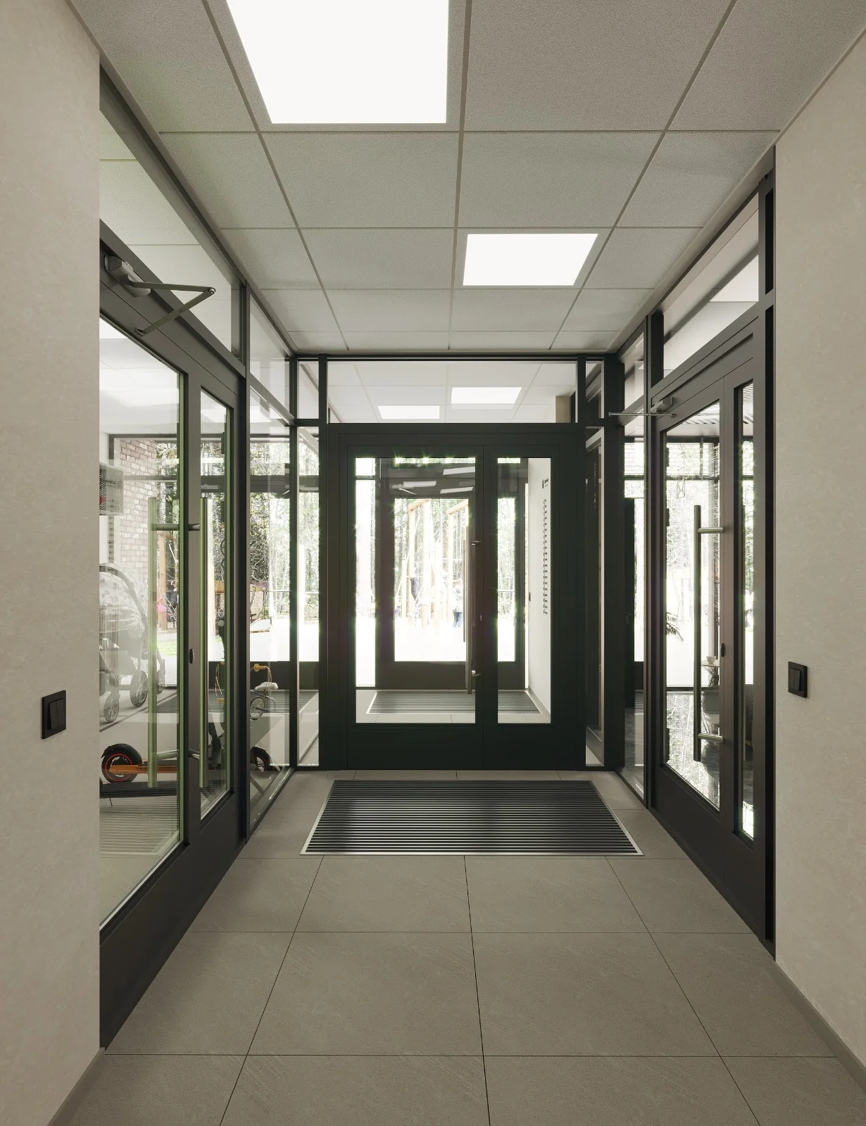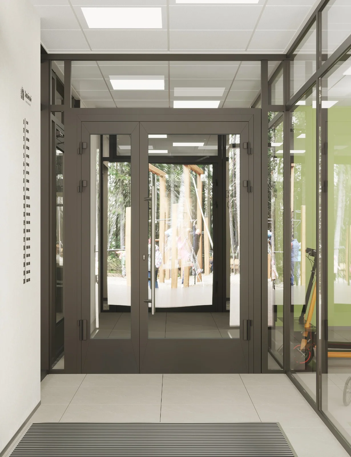 Входная зона с панорамным остеклением. Днём — естественный свет наполняет пространство, вечером — тщательно выверенное освещение создаёт тёплую и дружелюбную атмосферу. Доступ без ступенек продуман для комфортного передвижения с коляской.
