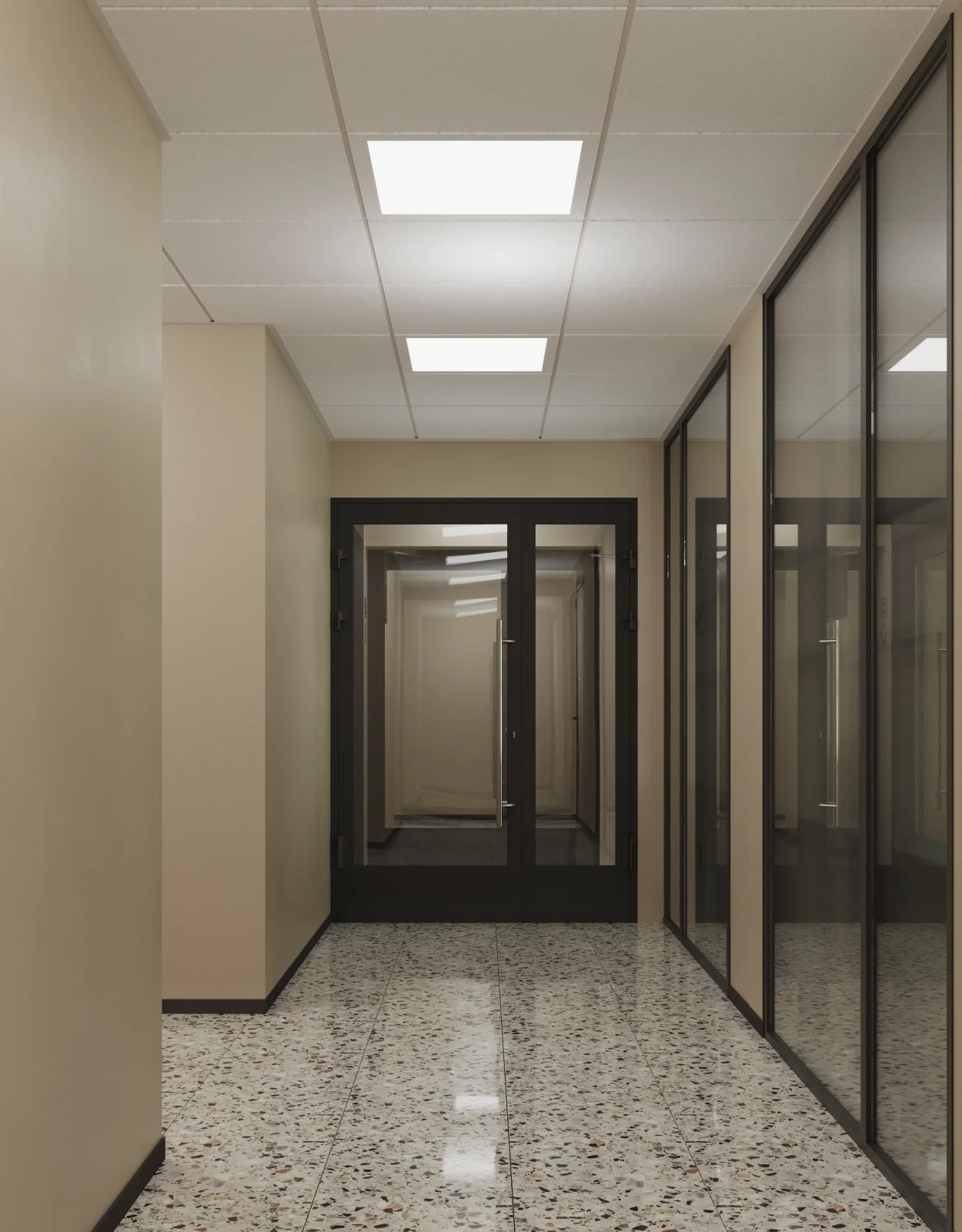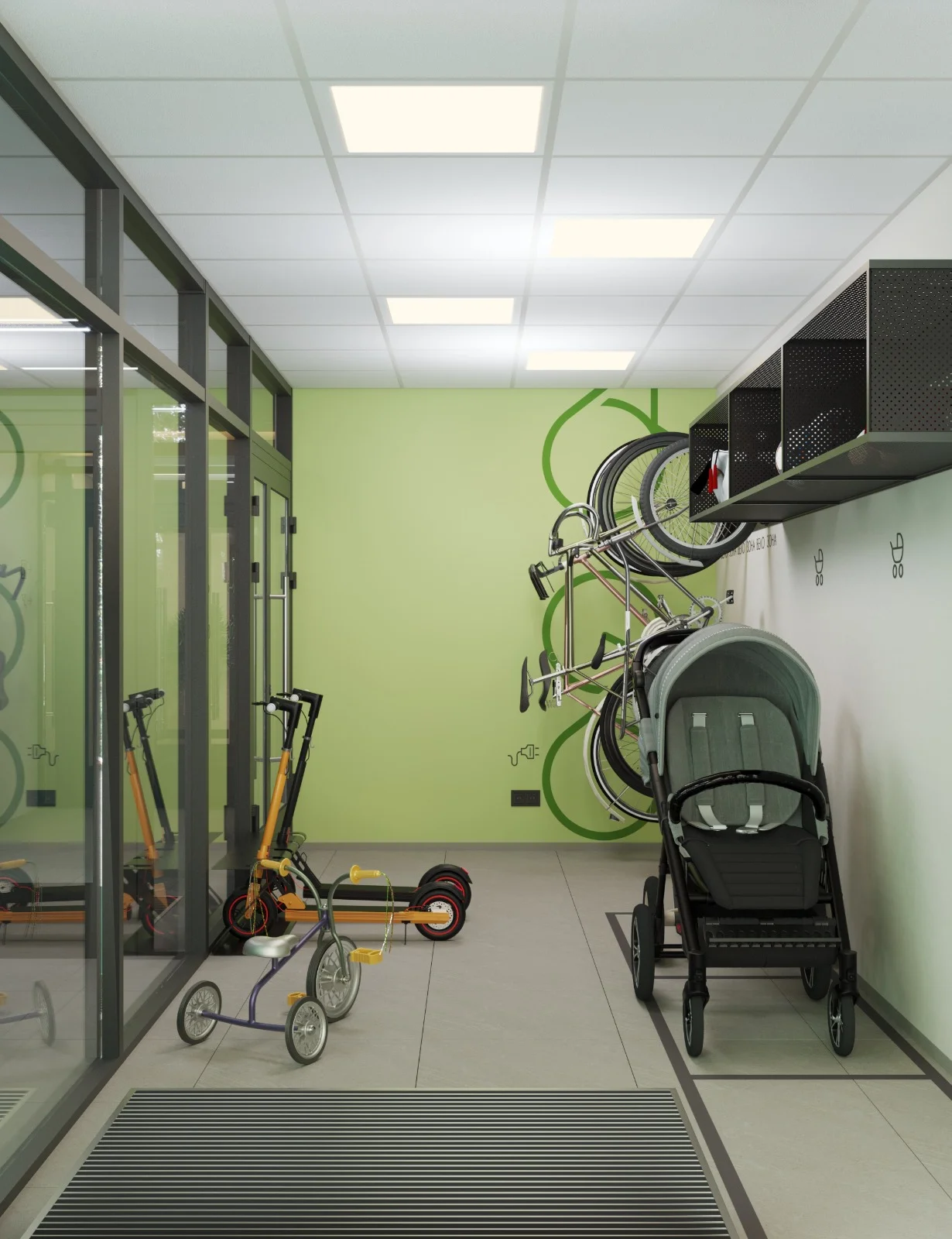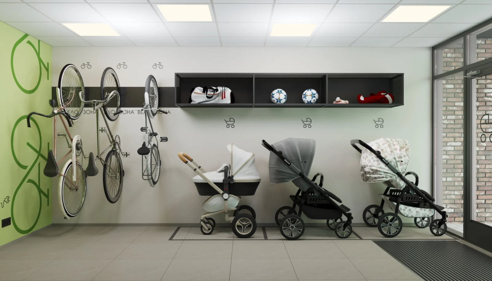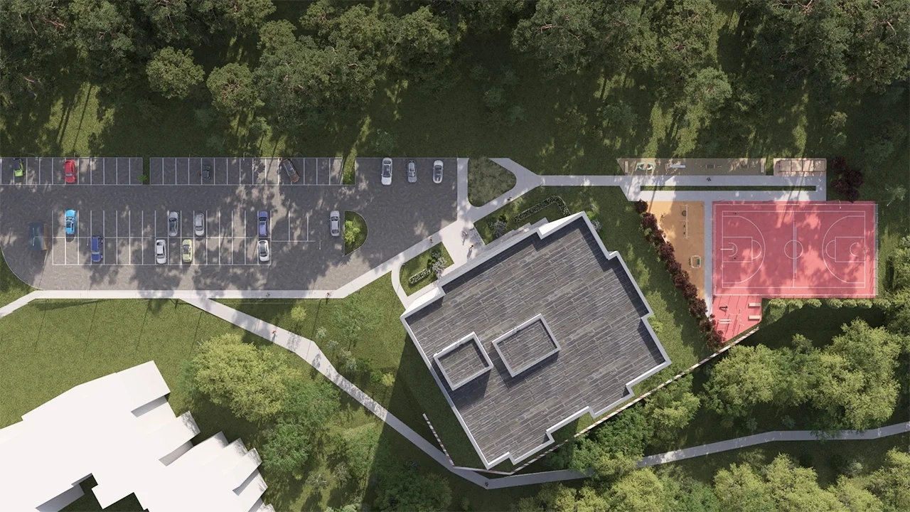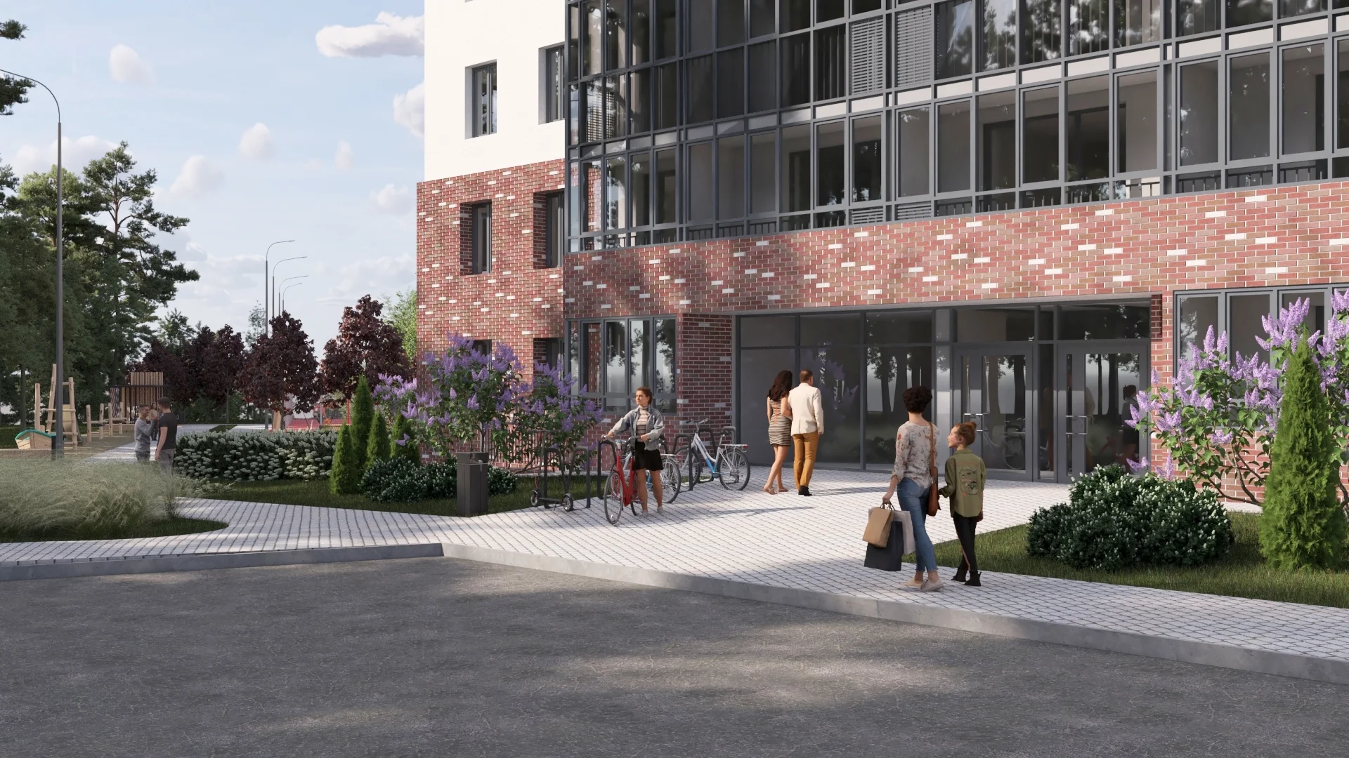 Входная зона с панорамным остеклением. Днём — естественный свет наполняет пространство, вечером — тщательно выверенное освещение создаёт тёплую и дружелюбную атмосферу. Доступ без ступенек продуман для комфортного передвижения с коляской.