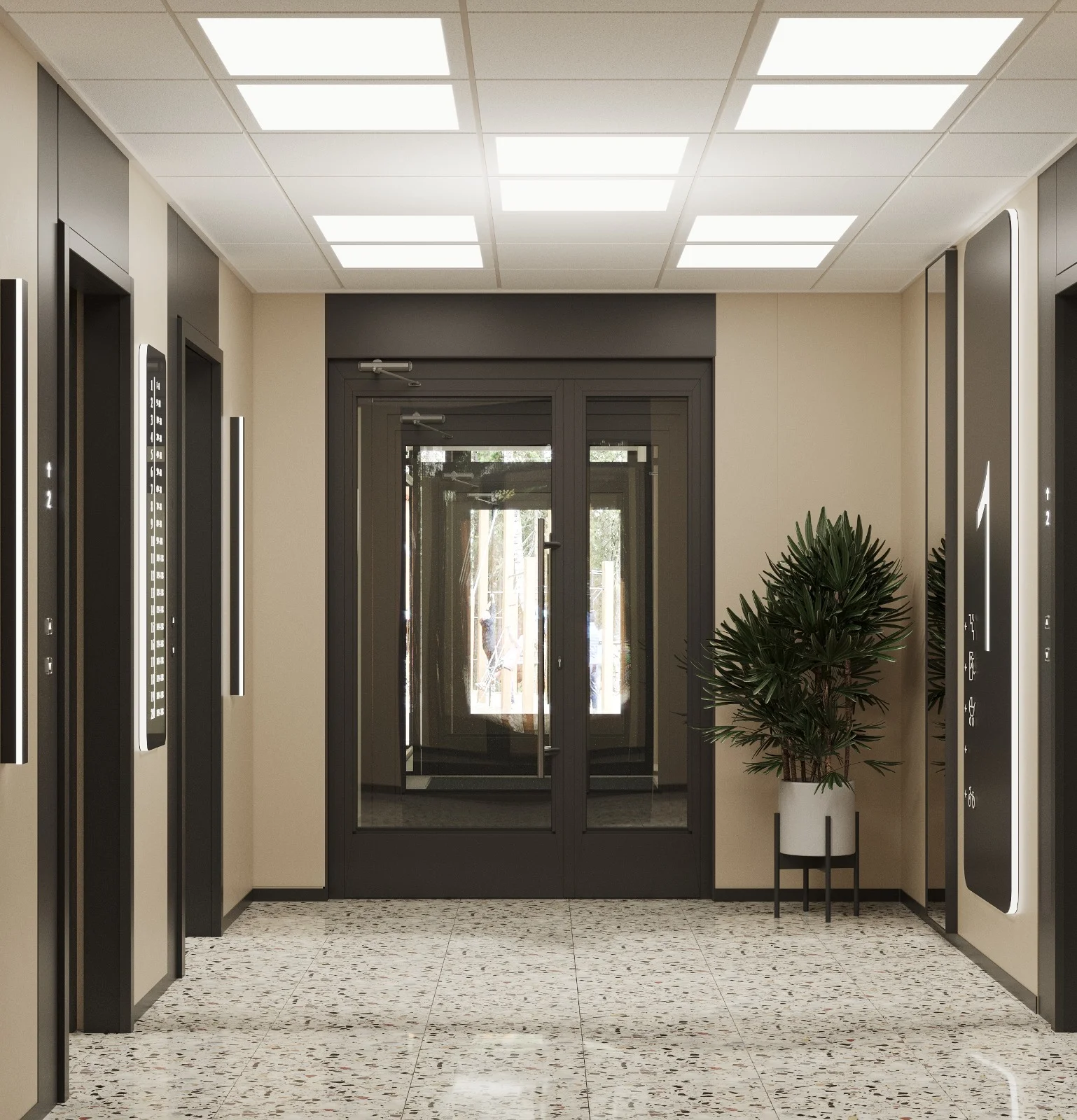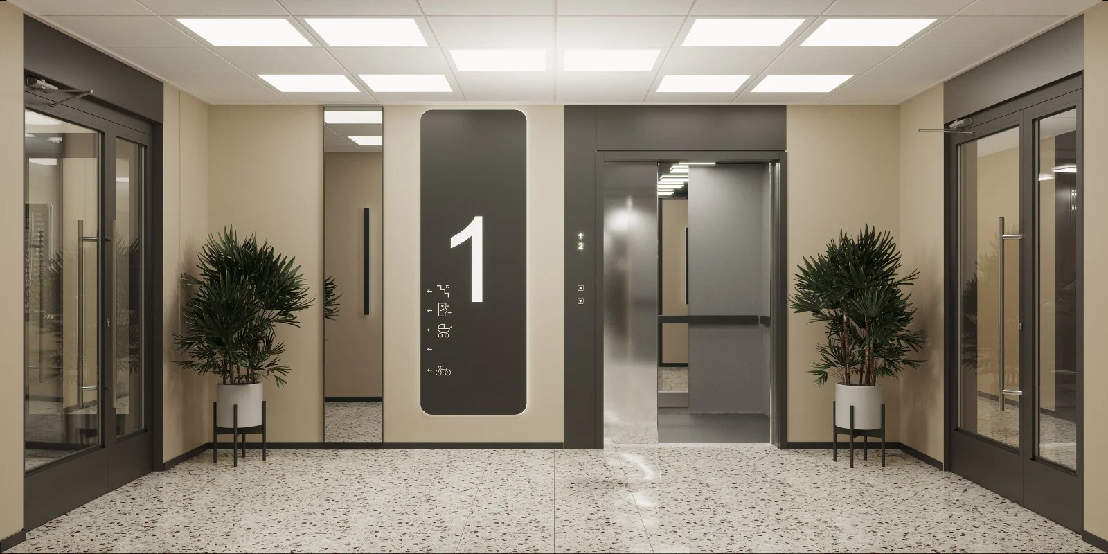 Зона ожидания и отдыха — в светлых, мягких тонах, с удобными посадочными местами, где каждая деталь служит комфорту и эстетике. Три лифта премиального бренда обеспечивают бесперебойную и тихую связь этажей и являются визитной карточкой дома — качественно, безопасно, спокойно.